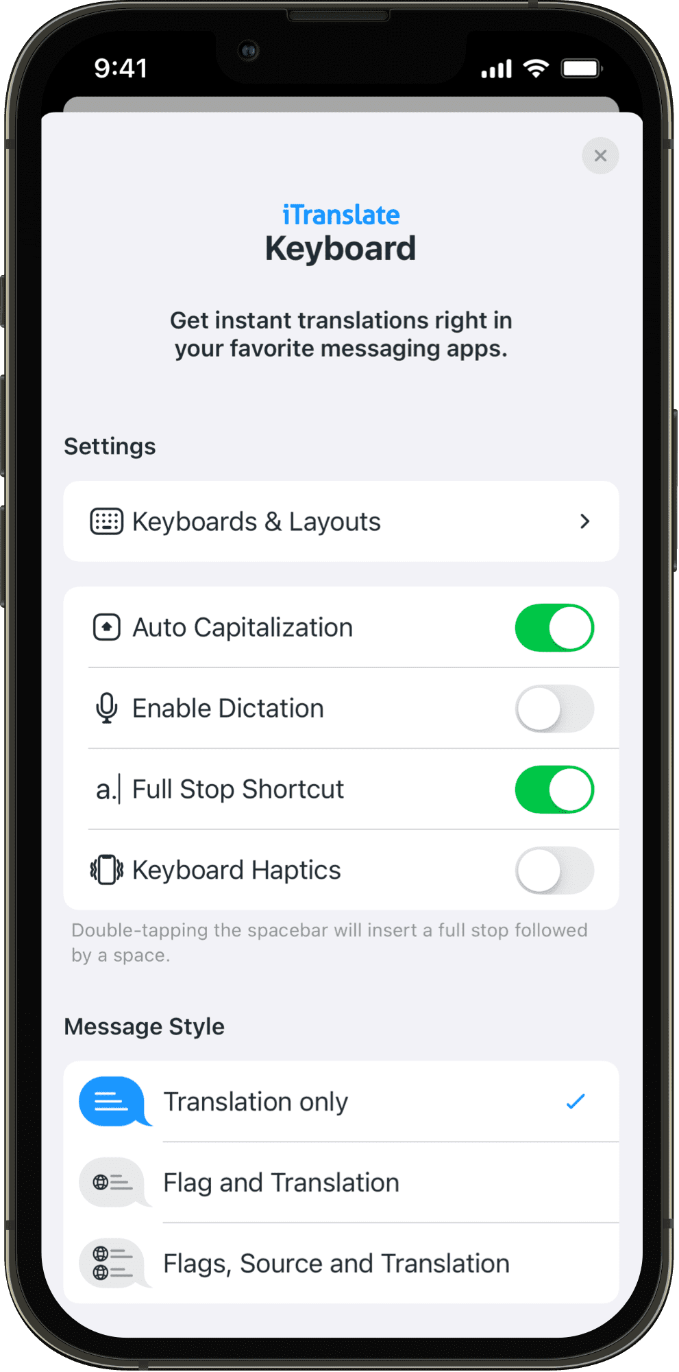 Get instant translations right in your favorite messaging app. With iTranslate’s keyboard extension you can stay in touch with friends all over the world.